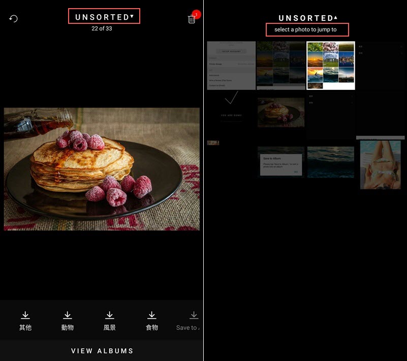 如果想跳到未整理的部分,就點上方「UNSORTED」再選擇相片。