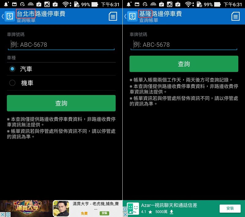 路邊停車費的部分,阿湯點進去發現每個縣市可查詢的內容有些微差距,像台北、新北、台中、台南等縣市有分汽車機車的選項,有的縣市就沒有分車種,下面的備註也有一些小差別。