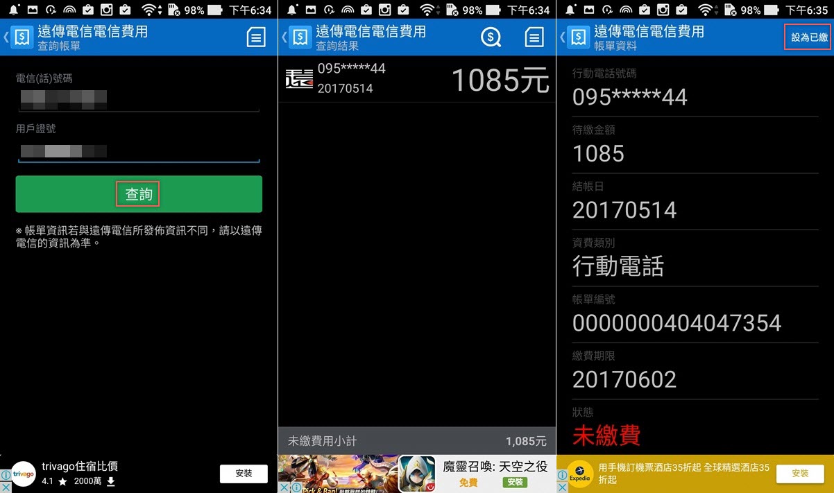 查電話帳單就輸入身分證字號和電話,查出來有一筆未繳,點進選項可以看到結帳日、繳費期限、跟繳費狀態,因為更新需要一點時間,如果已經繳了就點右上角「設為已繳」。