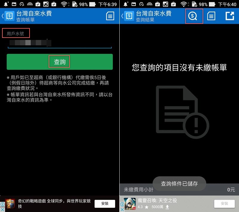 查水費就輸入水號,但中間不用加「–」不然會查不到,阿湯都很乖有按時繳錢,如果要查下一筆就點右上角圖示即可。