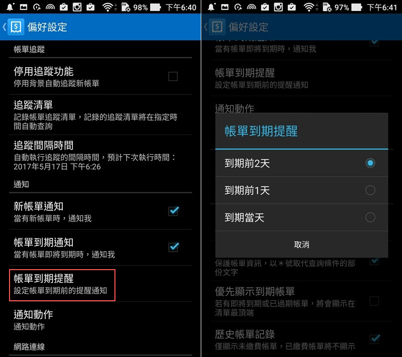 重要的是在「偏好設定」設帳單到期提醒,看要選到期前 2 天、1 天還是當天,幫你一起記時間才不會又忘記繳。