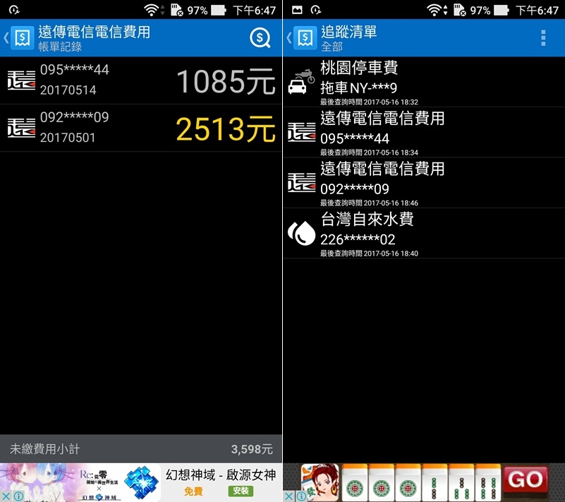 其實像電信費也可以多存幾組資料,例如家裡有兩個人用遠傳的話,就一起查詢後存起來,在追蹤清單一樣可以看到,結果後面這筆費用的地方顯示黃字,原來是快過期了。