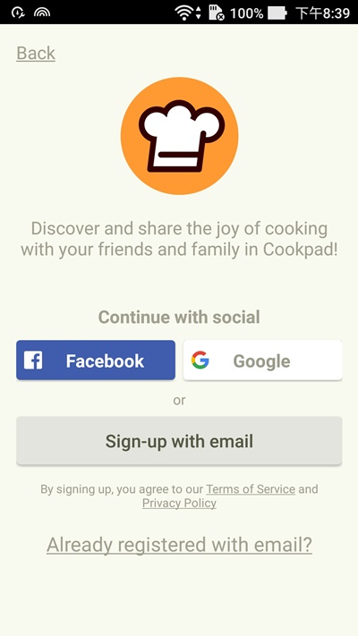 因為強調「分享」,所以一開始使用一定要註冊,可以用 Email、Facebook 或 Google 登入。