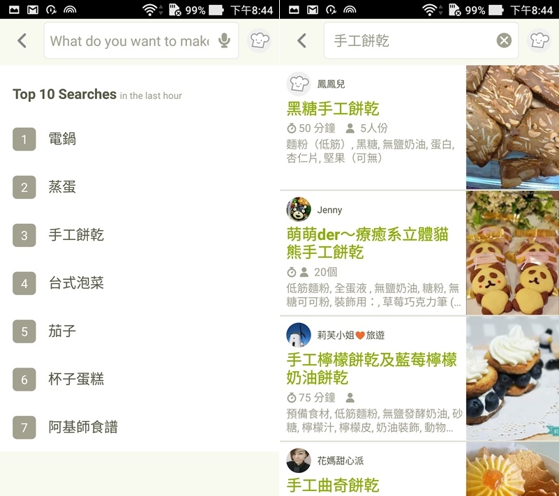 也可以點上方輸入關鍵字來搜尋,出現目前搜尋的排行榜,看看手工餅乾好了,馬上出現關於手工餅乾的食譜,作者、標題、食材、縮圖都有。