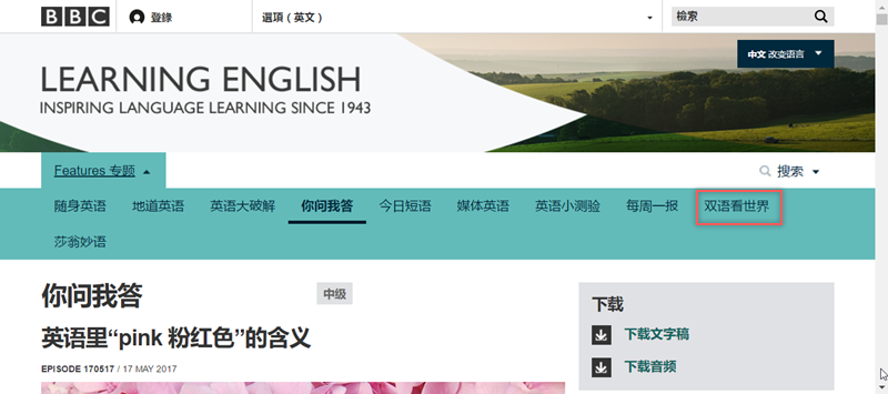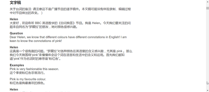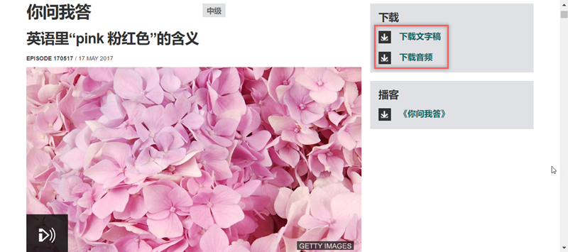 這期是英文裡「Pink 粉紅色」的含意,是 5 月 17 日最新一期的內容,點圖片左下角就能播放,如果想保存,可以在右邊點下載文字稿或音頻。