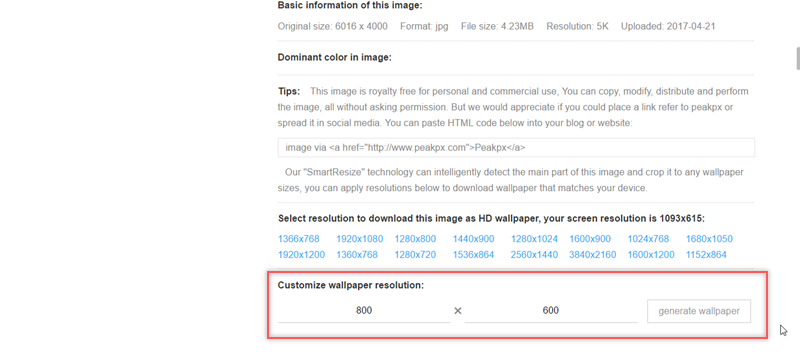 往下滑除了有這張照片的標籤、原始尺寸、拍攝時間、簡介等,還提供了多種不同尺寸可選擇下載,不然也可以自行輸入想要的尺寸,例如阿湯輸入「800*600」點「generate wallpaper」。