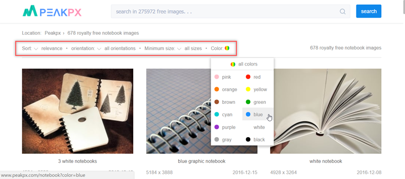 符合結果的有 678 張,預設是用相關性的來排序,也可以改成最新或是最熱門,前面幾張都是筆記本,阿湯是想找筆電所以要往後翻到第二頁才有出現,不過這些內容都可以從形狀、大小再細分,或是從顏色來找,例如「Blue」。