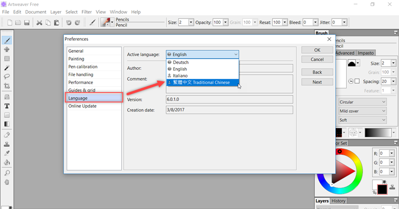 開啟「Artweaver Free」,從 Edit → Preferences → Language 打開第一個選項往下找到「繁體中文」點「OK」 。