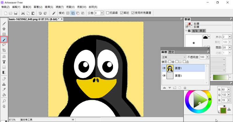 先用最基本的去背功能,假設要將這隻企鵝去背,先新增一個透明圖層,再到左排選擇魔術棒,點背景區。