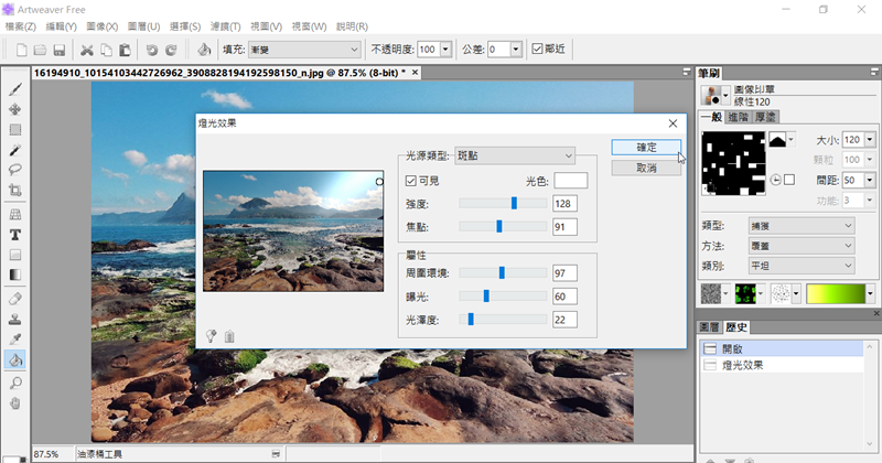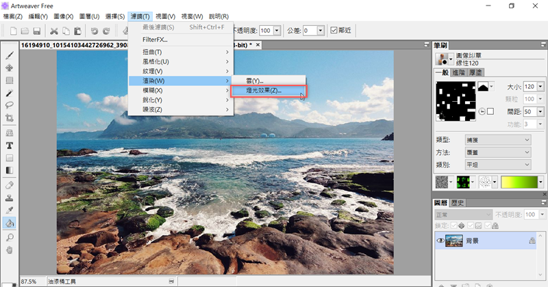 再來簡單試試修照片的效果,加入濾鏡,在渲染區選擇「燈光效果」。