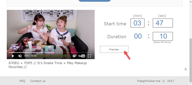 讀取後往下滑,左邊會播放影片讓你挑選,然後在右邊填上開始的時間與整個 GIF 檔的時長(不能超過 10 秒),點「Preview」預覽後就開始製作。
