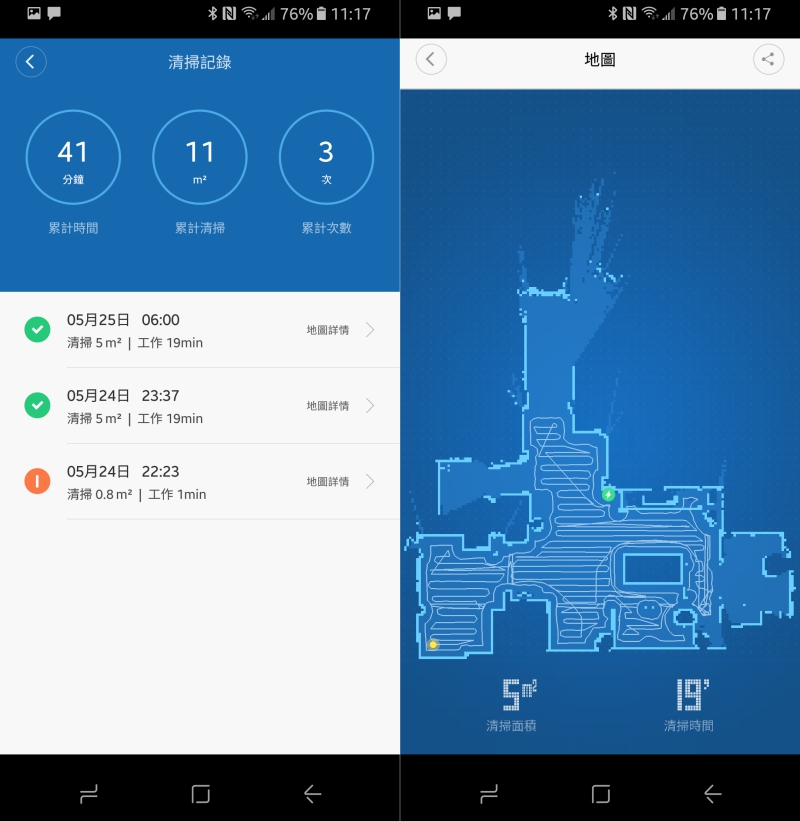 清掃記錄可以詳細的看到掃地機器人跑的路徑,就可以知道有哪些區域沒清潔到,再進一步確認沒清潔的原因,不得不說空間地圖真的建構的很準確。