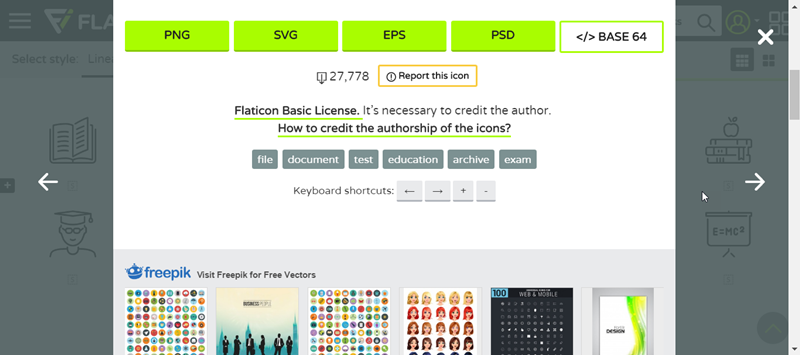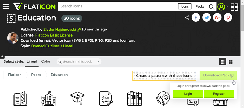 點一組來看,像這個教育類的 20 個圖標除了有作者介紹、檔案格式還附上許可證,也可以在右邊點圖示分享。