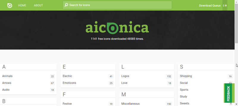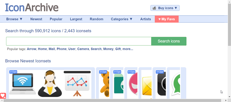 網站收集了 59 萬個圖示、2 千多個組合包,包含一些比較大的圖檔,首頁的檔案就有 512 px,網站中的圖標有些可商用有些不可,要看下面的註記。