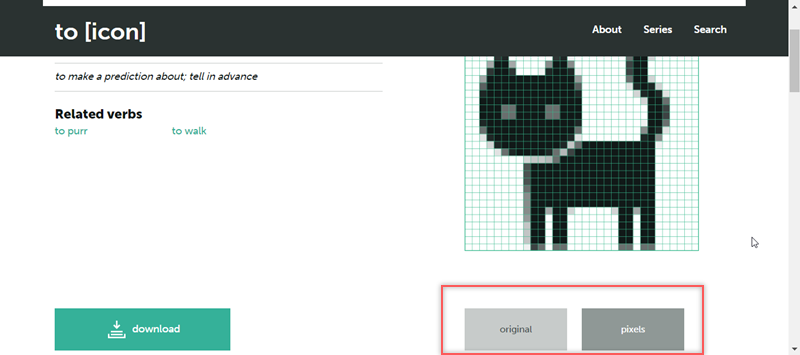 看看這隻貓咪,阿湯是把它切換成 pixels 檢視,點「download」下載壓縮檔(SVG),下載前網站會提醒你記得要標示出處。