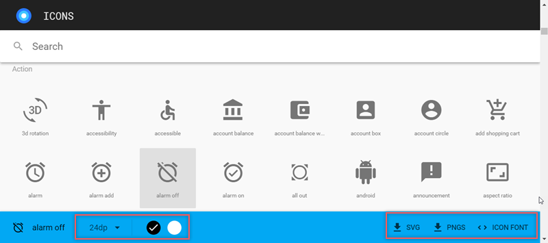 使用模式非常簡單,直接在首頁找到要用的圖示點下去,下排就會出現四種大小、黑色或白色,以及 SVG、PNGS、ICON FONT 可選,點它就直接下載了。