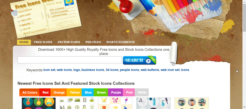 首頁可以選擇免費圖示、向量圖示、PSD 檔案或 WEB UI 元素,也可以直接點顏色分類搜尋。