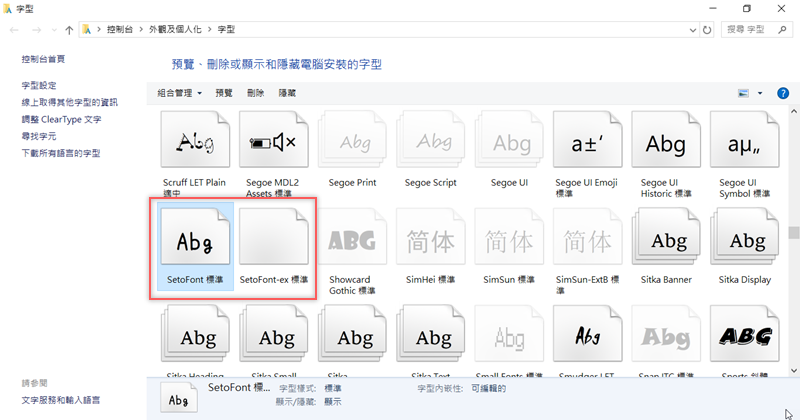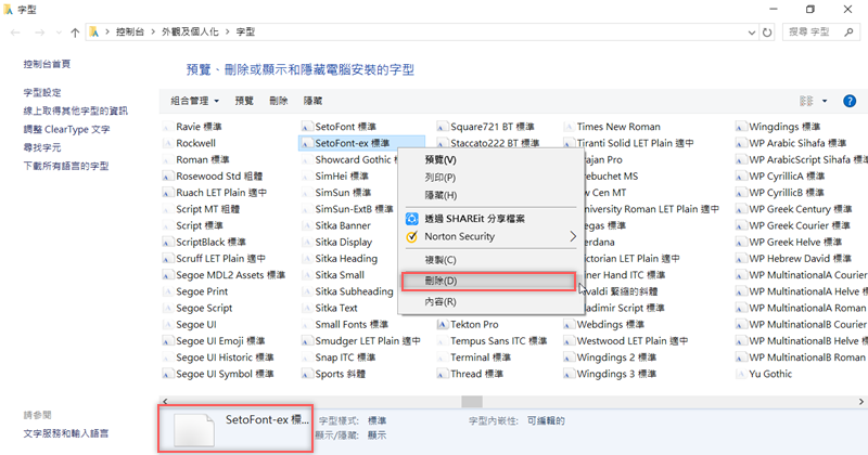 回到控制台裡的字型區,點字型檔案下面預覽區其實就可以看到是空白的,按右鍵刪除。