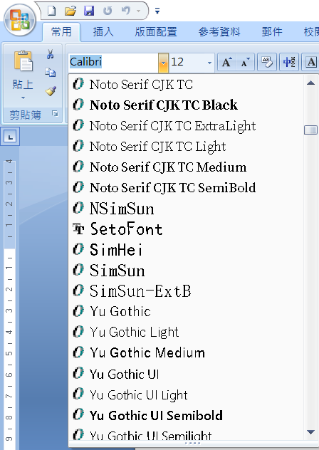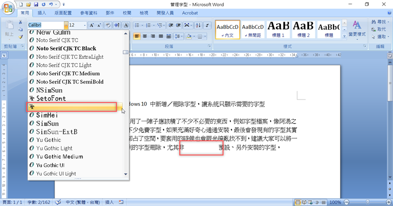 打開要編輯的檔案,一樣找剛剛那兩個字型試試,結果發現另一個套用後字體變成空白,那就不需要占空間。