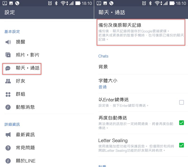 手機開啟 Line 到設定的地方,往下滑找到「聊天.通話」進去第一項「備份及復原聊天紀錄」。