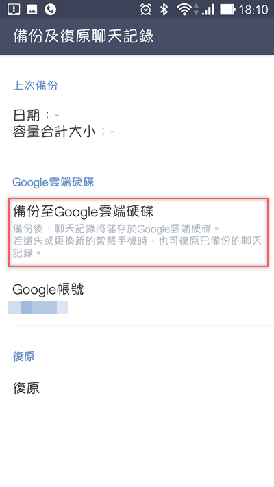 完成後會顯示日期時間和容量,這些內容如果從電腦查看雲端是看不到的,換機後直接點最下面「復原」所有聊天紀錄就全部回來了,以最後一次的備份紀錄為主。