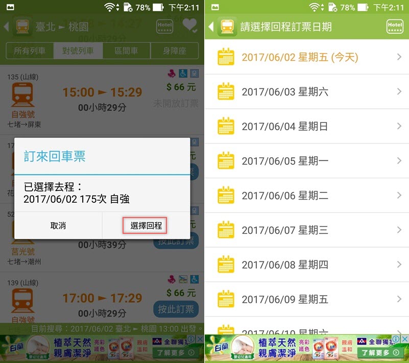 看要訂單程、來回還是查剩餘車票,並輸入資料送出,如果點預定住宿會連到訂房網站,還蠻方便的。