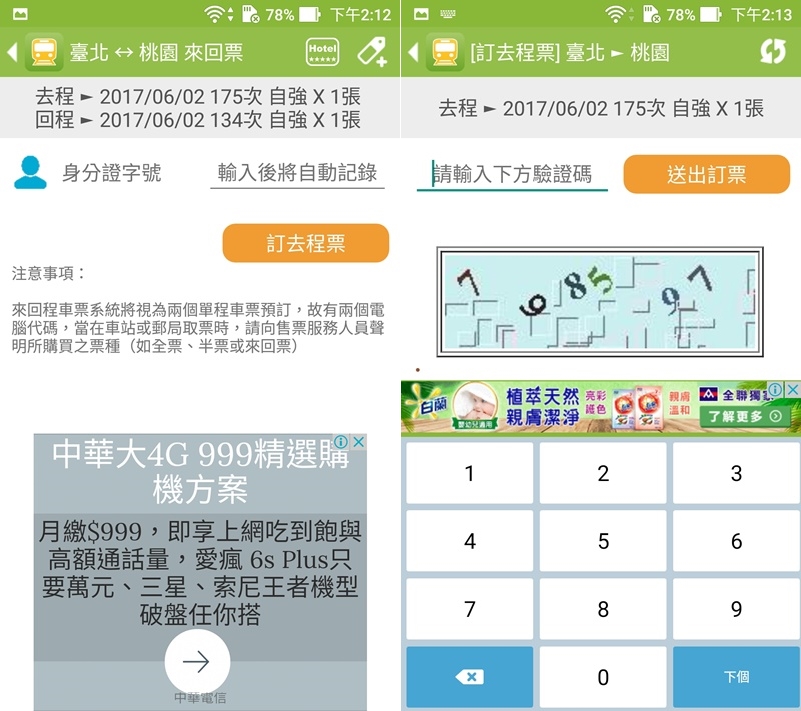 輸入身分證字號和驗證碼,將去回分開來訂。