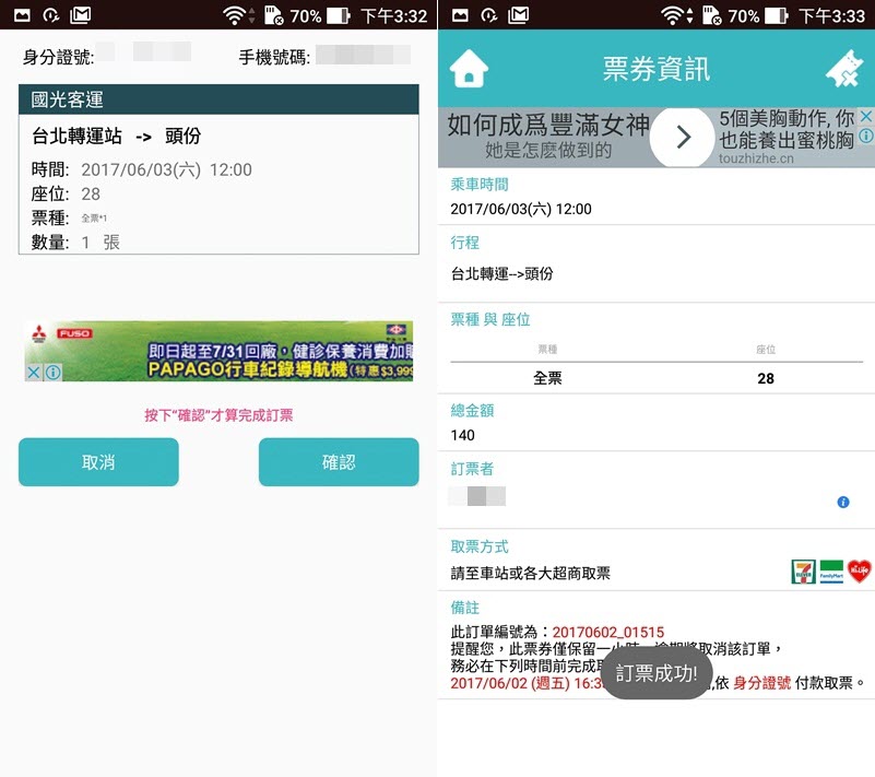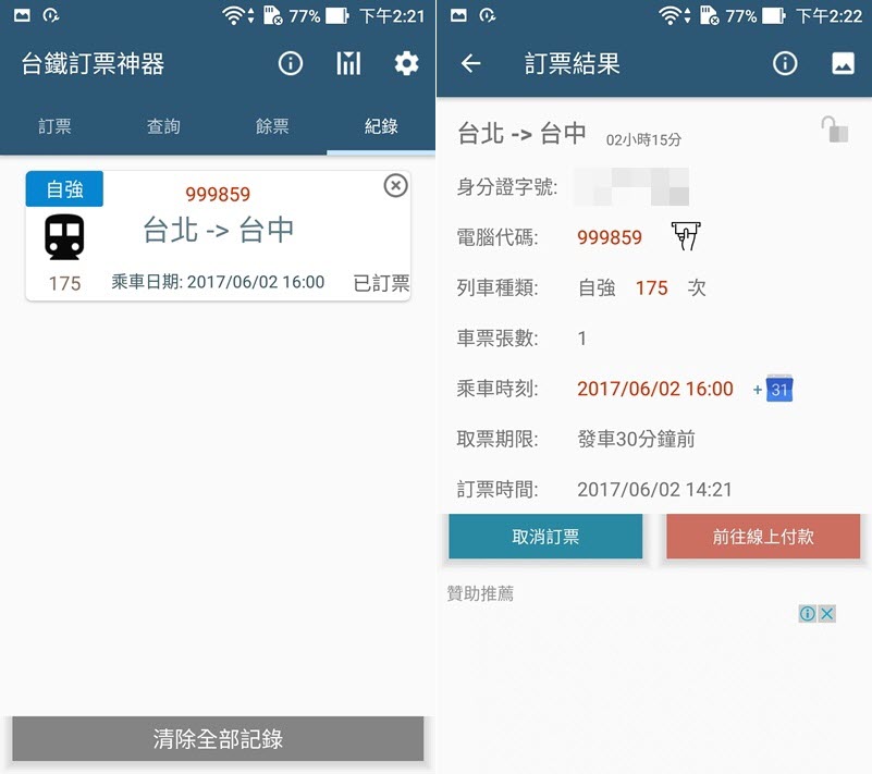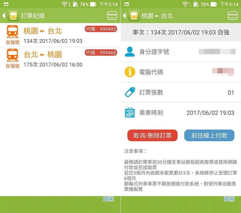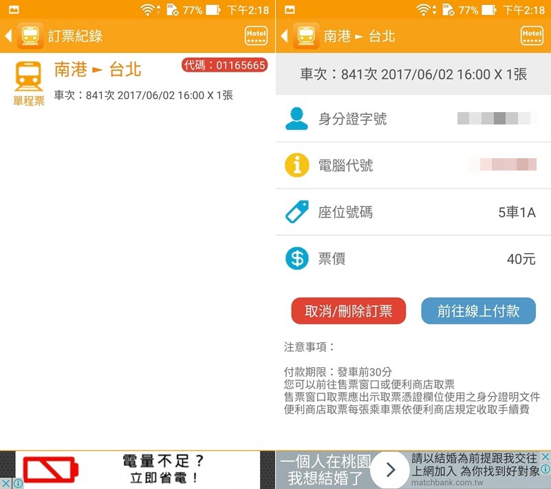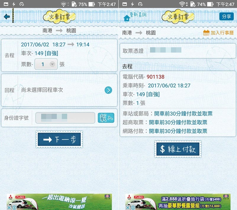 最後也是可以線上付款,或者前 30 分鐘到車站或超商領票。