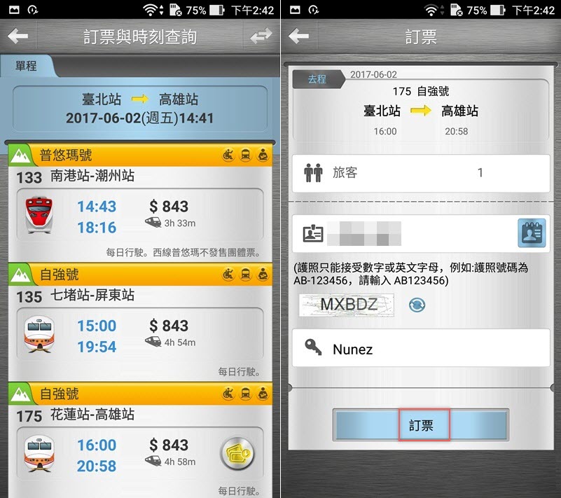 搜出來的結果列表也很清楚,選好點右邊綠色那塊,一樣要輸入身分證字號與驗證碼才可以訂票哦。