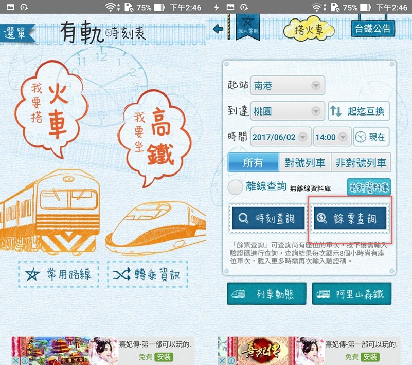 跟上面的台鐵訂票通是同一個開發商,介面和使用方式都一樣,點查詢後擇一定票即可。