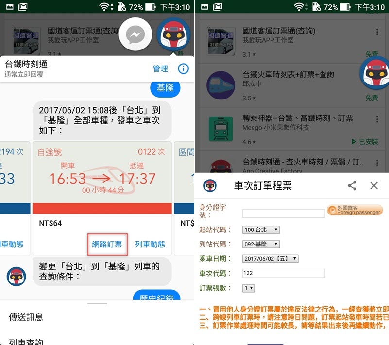 這個比較特別是用 Messenger 跟台鐵 NPC 聊天的方式,看要查車次資訊或訂票都會迅速回覆你。