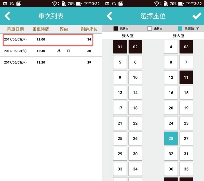 列表可看到日期時間和經由哪個交流道,座位可自選。