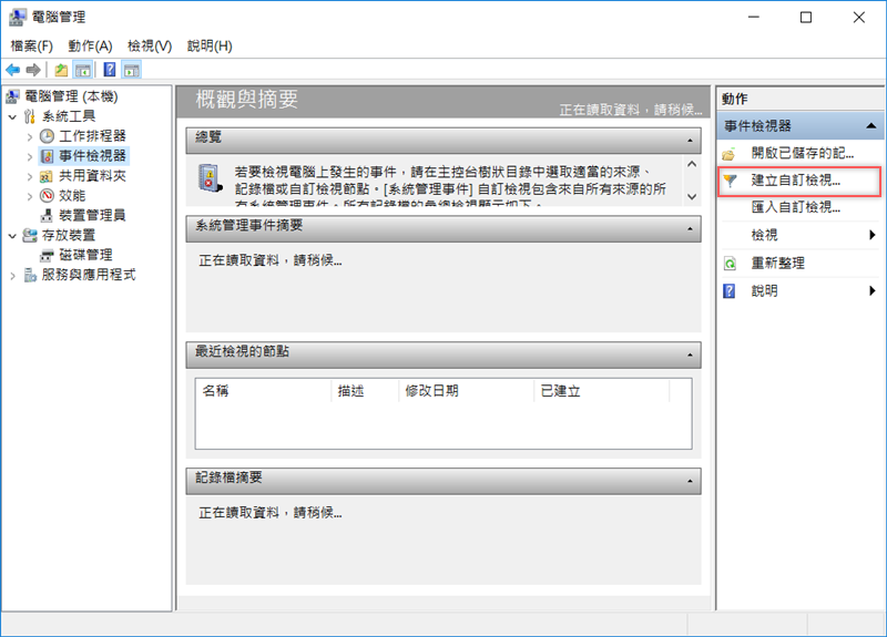 在左邊系統工具的子選項找到事件檢視器,並在右邊的動作視窗「建立自訂檢視」。
