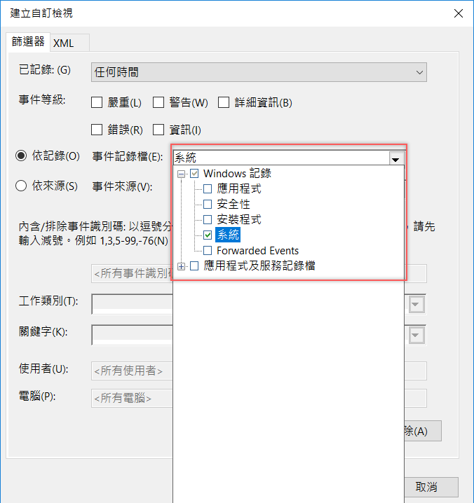 往下看到事件紀錄檔,打開下拉式選單再將 Windows 記錄點開,勾選「系統」。