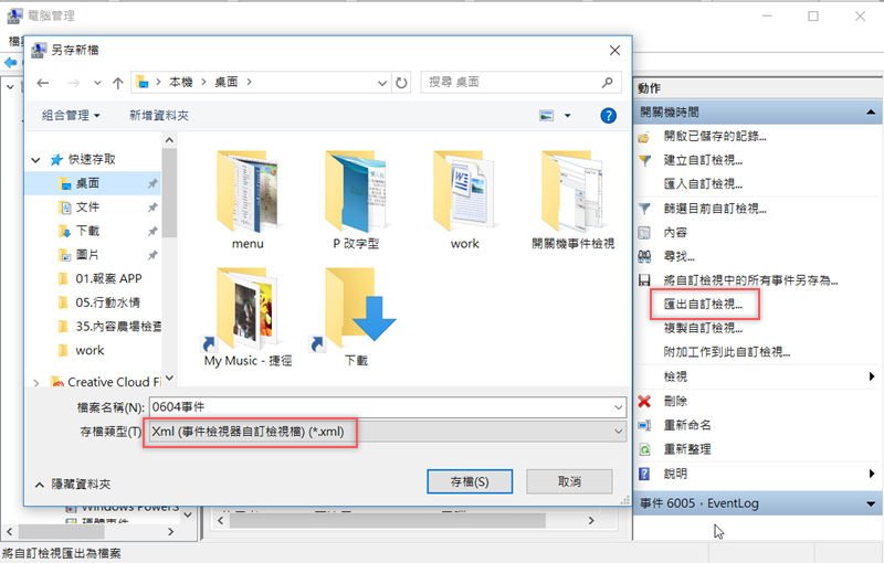 如果要將事件紀錄匯出,就在右邊找到「匯出自訂檢視」,存成 Xml 檔。