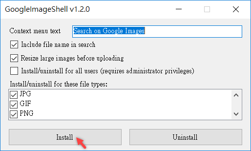 勾選要套用的圖片類型,預設是全勾,功能名稱也能更改,然後點「Install」。