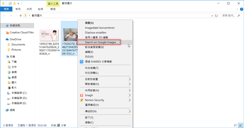 安裝完成,假設阿湯下載了一堆寵物圖片想找來源,就將它們全選後按右鍵找到「Search on Google Images」。
