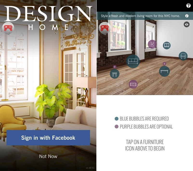 開啟後要先用臉書帳號登入,不然沒辦法用,登入後就先出現一個模擬的客廳讓你玩玩看。