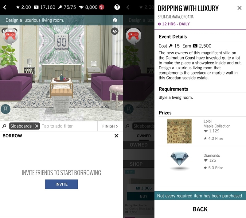 布置完後,可以邀請臉書朋友來獲得鑽石,不然你買的家具可能會不夠錢無法完成任務