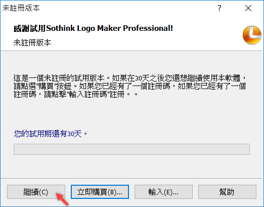 解壓縮安裝後,會出現 30 天試用的提示,按繼續。