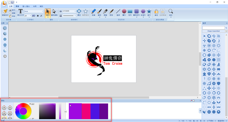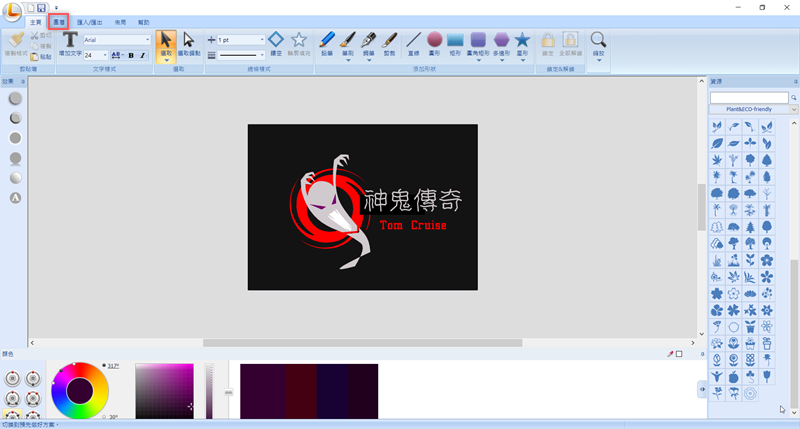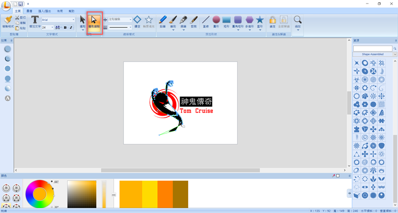 大家都知道阿湯最近演的電影上映了,那就來做個 Logo 吧,先點圖片上字的地方,然後在左上角改字型和大小,底下的形狀也從右邊選個圖案來改,把原先的方塊改成像漩渦這樣。