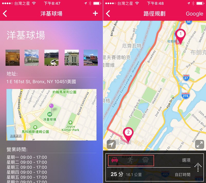點景點進來有旅遊資訊,包括地址、營業時間跟最重要的地圖,也可以連到路線規劃,提供開車、走路跟大眾交通工具的選擇,及不同的花費時間可參考。
