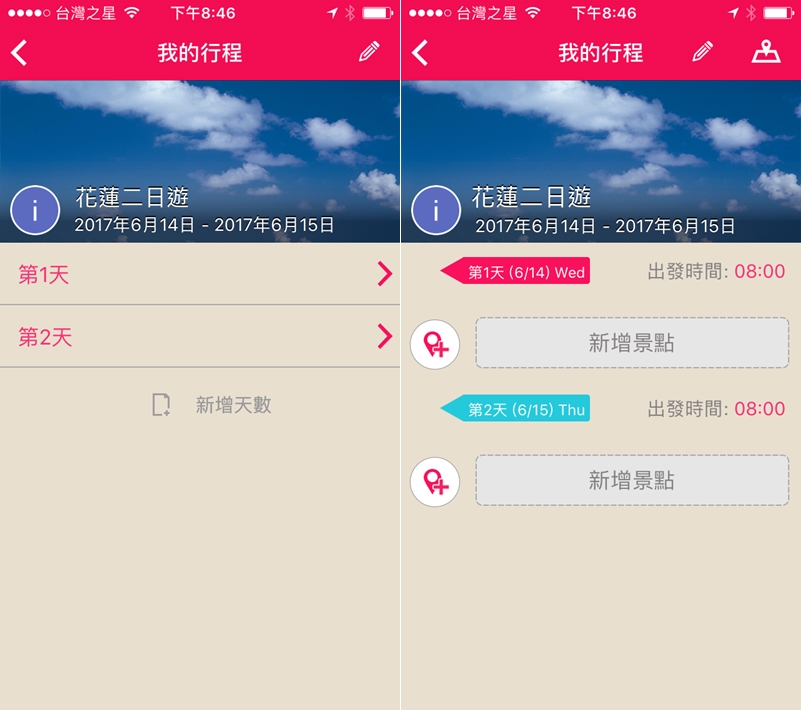 就跟範例一樣,何時出發、花費時間、到哪個景點都可自由編輯或選擇,十分方便。