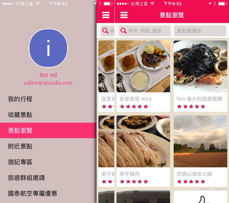 左方功能列點開可查詢收藏的景點或瀏覽附近景點,也可依國家或關鍵字搜尋。