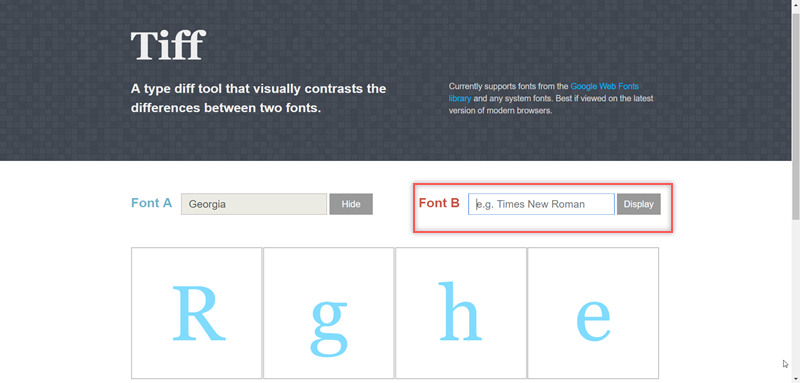 左邊「Georgia」是預設的範例,在下面以淺藍色顯示,在右邊輸入要比較的字體。