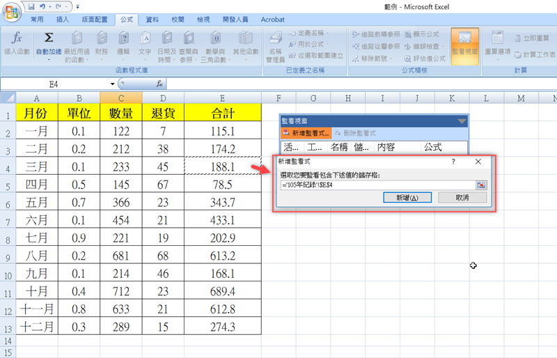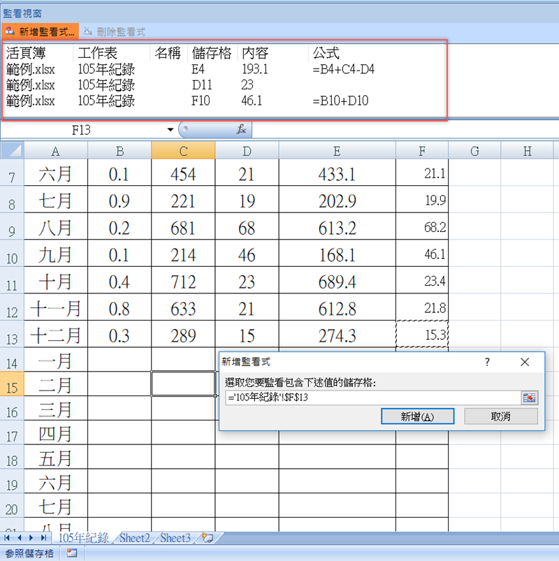 按「新增監看式」,然後用滑鼠點你要觀察的視窗,空白處會顯示儲存格的值,確認後點新增。