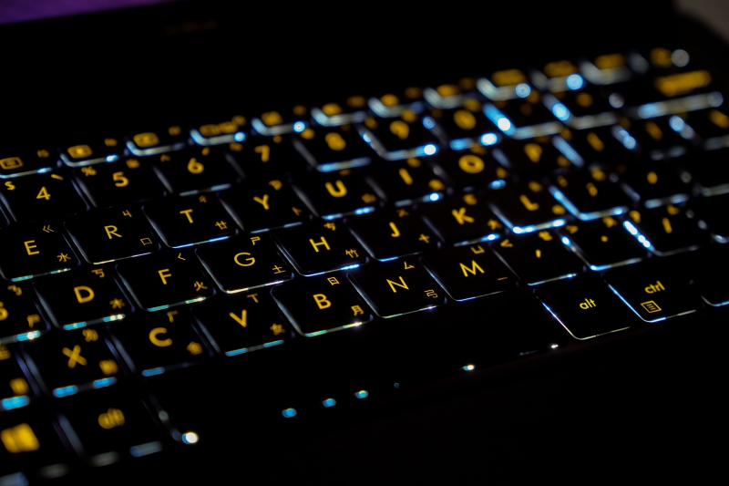 搭載全尺寸背光鍵盤,1.2 公釐按鍵行程,一般背光鍵盤都是黑底白字,沒想到這黑底金字在背光顯示下更加好看啊。
