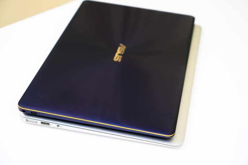 再補一張正上方和 Macbook Air 的比對給大家看,左右的寬度是幾乎差不多的(ZenBook 3 Deluxe UX490 稍大一點點),但是上下就有很明顯的差異了,一比較真的超有感。