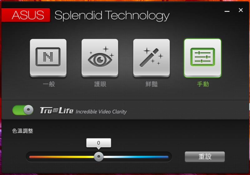 對於長期使用電腦的習慣,通常會透過濾藍光等方式來達到護眼的效果,也就是讓你的眼睛長期看螢幕的狀況下能舒緩一些,而 ASUS 的 Splendid Technology 技術就可以依你自己的需求及習慣來調整螢幕的呈現效果,除了基本的三種調整方式(一般、護眼、鮮豔)之外,也能手動自行選擇色溫,調整出你覺得最舒適的呈現方式。