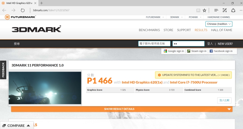 3DMark 中,透過 Performance 1.0 測試獲得 1466 分。